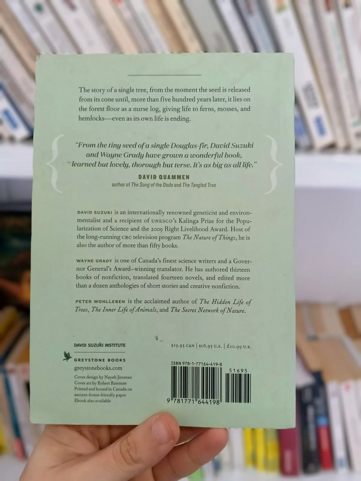 The story of a single tree, from the moment the seed is released from its cone until, more than five hundred years later, it lies on the forest floor as a nurse log, giving life to ferns, mosses, and hemlocks, even as its own life is ending. In this unique biography, David Suzuki and Wayne Grady tell story that spans a millennium and includes a cast of millions but focuses on a single tree, a Douglas fir, Tree describes in poetic detail the organism’s modest origins that begin with a dramatic burst of millions of microscopic grains of pollen.